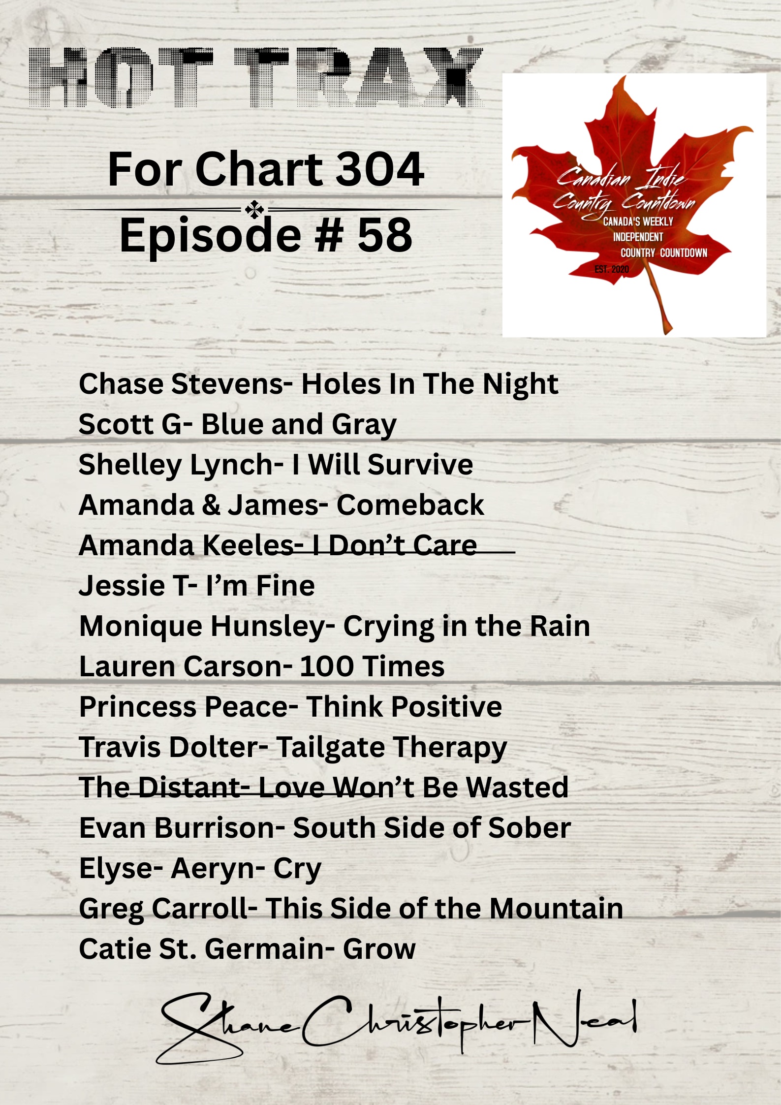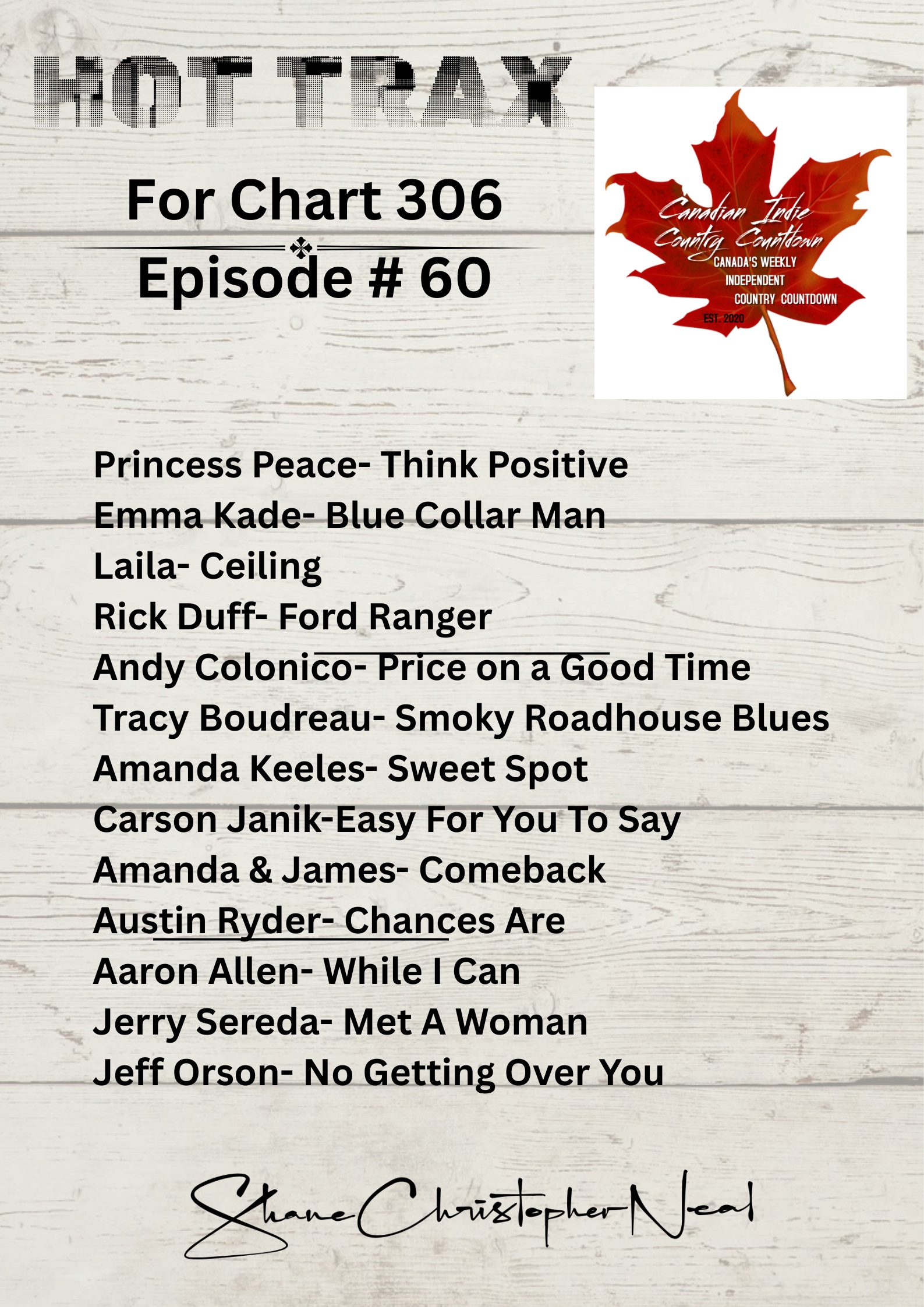 Shane Christopher Neal is the Host of HOT TRAX as part of the Canadian Indie Country Countdown airing each week on multiple AM/FM and On-Line Radio Stations including 91.3FM Bluewater Radio in Walkerton, KICR Radio in Branson Missouri, Coyote 103FM Radio in Sarnia and 4680Q in Niagara Falls. The Show also airs on radio in Australia, Newfoundland, Montreal and in Las Vegas and Los Angeles.